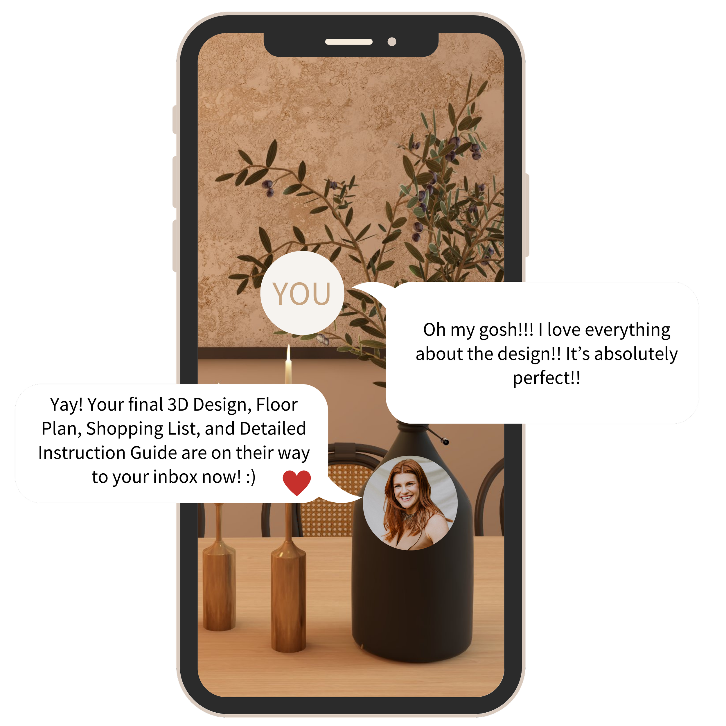 After we chat through your design, we’ll take care of the finishing touches. Then you’'ll receive your final 3D Design, Floor Plan, Clickable Shopping List (within your budget, of course!), & Detailed Instruction Guide.